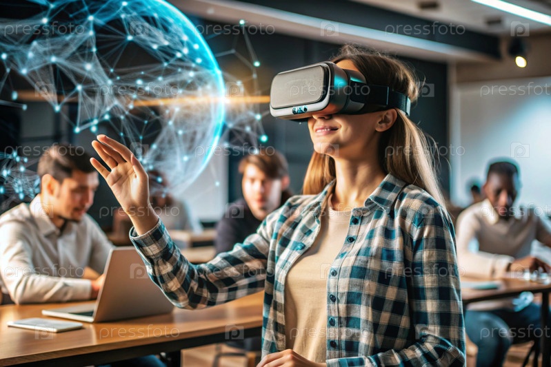Девушка в очках виртуальной реальности. Ребенок находится в классе, с другими учениками на заднем плане. Цифровой интерфейс отображается в наушниках