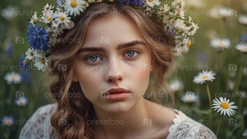 Красивая девушка с венком из ромашек и кукурузных цветов на голове в поле. День святых Петра и Февронии. Всероссийский день семьи, любви, верности