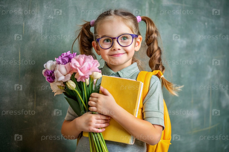 Красивая первоклассница с очками и хвостиками на голове. В руках букет осенних цветов. Ребенок впервые ходит в школу. Ребенок с рюкзаком, книгой и цветами. Вернемся в школу