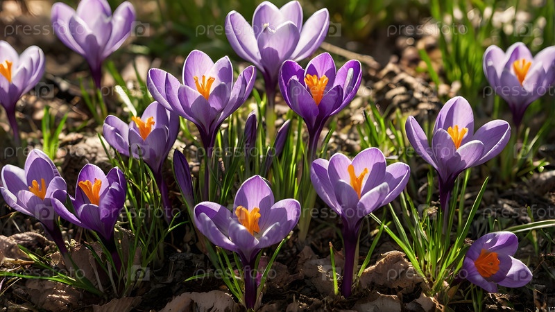 Первые весенние цветы. Фиолетовые крокузы (лат. Crocus) крупным планом при утреннем солнечном свете