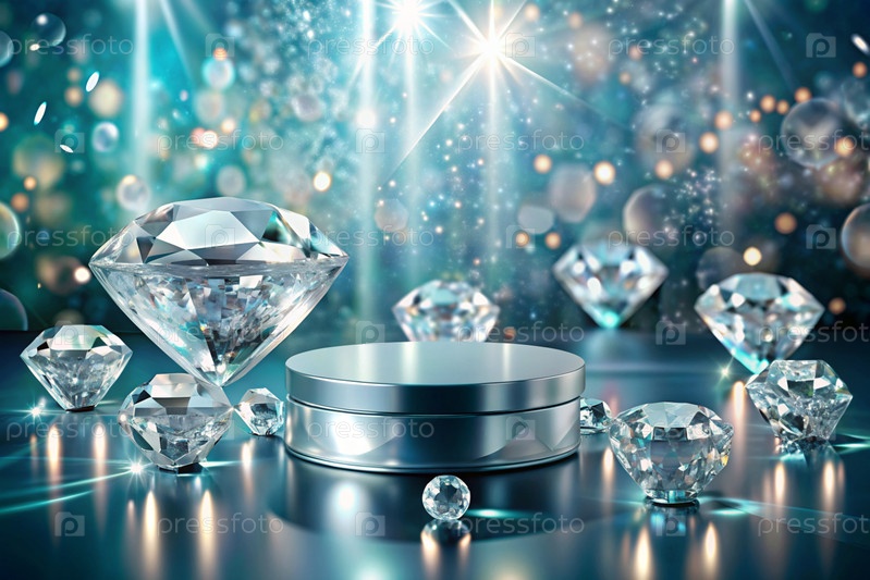 Минималистический фон для демонстрации ювелирных изделий. Современный пустой подиум с серой стеной и бриллиантами. Креативный дизайн для презентации продукта