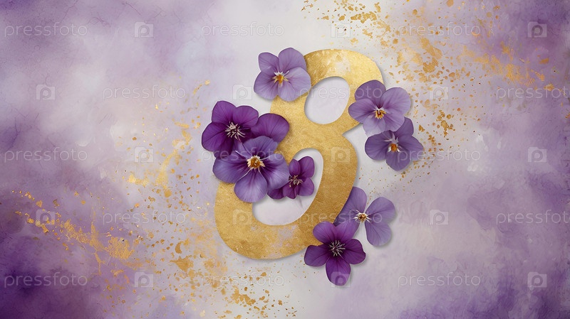 Международный женский день. Праздник приходится на 8 марта. Баннер, флаер. Праздничный, нежный фиолетовый цветочный фон с номером 8