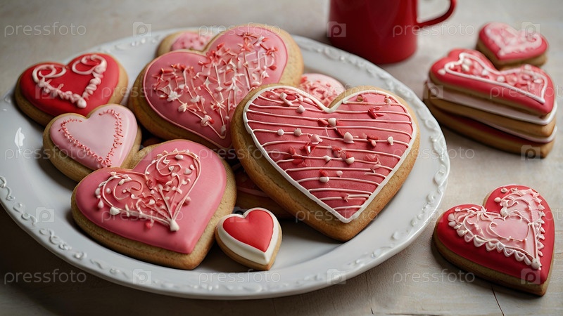 Домашнее имбирное печенье в форме сердца в красном сахаре. Вкусное имбирное печенье сердце на сером бетонном фоне. Свежеиспеченные пряники на День святого Валентина