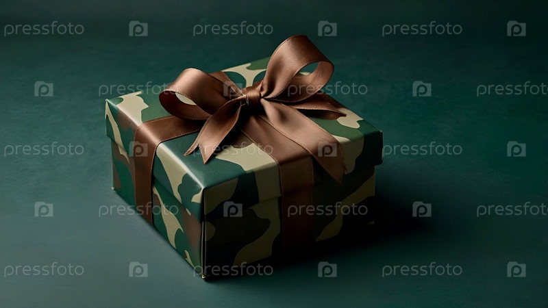 Концепция Дня защитника Отечества 23 февраля. Подарок камуфляжной коробки с праздничным атласным ленточным луком на темно-зеленом фоне