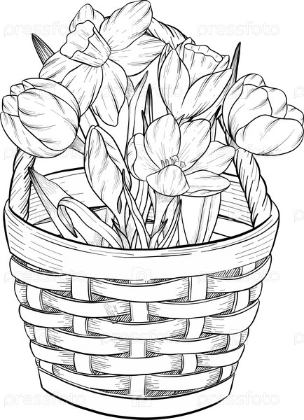 Пасхальный цветочный праздничный элемент декора установлен. Векторная иллюстрация в стиле чернил. Выгравированы очертания яиц, узлов, весенних садовых цветов и корзины. Монохромная графика в рисованном стиле линии для букетов, венков, открыток, поздравлен