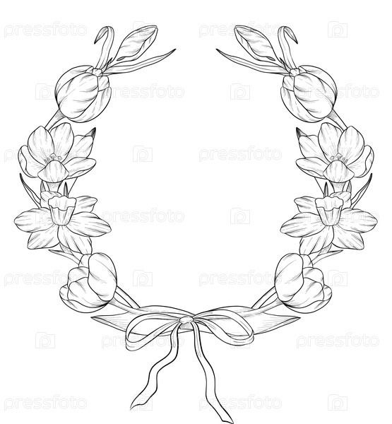 Пасхальный цветочный праздничный элемент декора установлен. Векторная иллюстрация в стиле чернил. Выгравированы очертания яиц, узлов, весенних садовых цветов и корзины. Монохромная графика в рисованном стиле линии для букетов, венков, открыток, поздравлен
