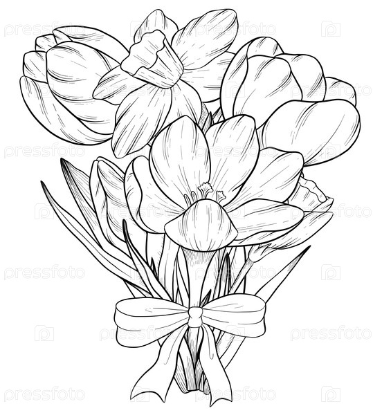 Пасхальный цветочный праздничный элемент декора установлен. Векторная иллюстрация в стиле чернил. Выгравированы очертания яиц, узлов, весенних садовых цветов и корзины. Монохромная графика в рисованном стиле линии для букетов, венков, открыток, поздравлен