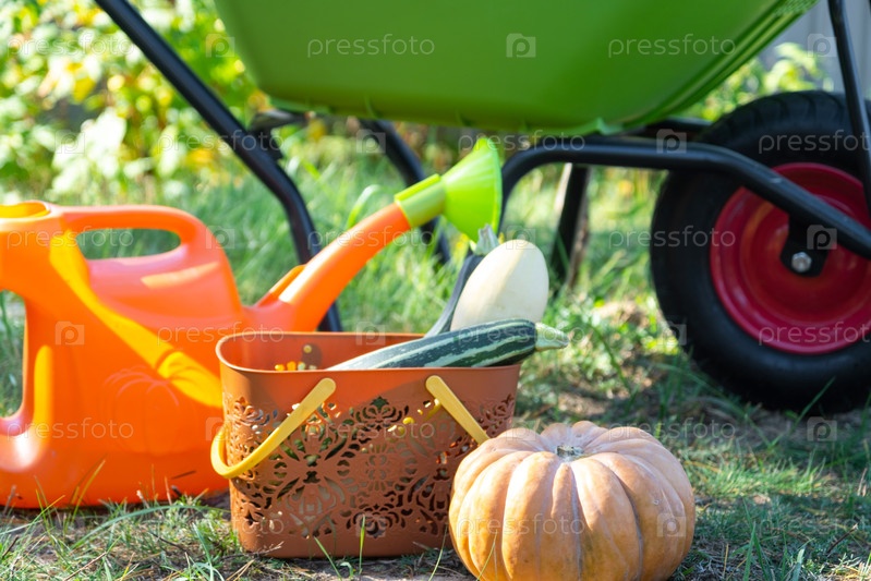 Сбор овощей в саду, тыквы, кабачков, помидоров, моркови в корзине рядом с поливной банкой и садовой тележкой. Праздник урожая, подарки осени, выращивание экологически чистых продуктов