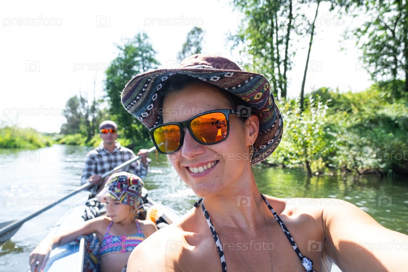 Мужская и женская пара, ребенок 8 лет, селфи счастливы в семейном путешествии на байдарках на лодке по реке, походе по воде, летнем приключении. Экологичный и экстремальный туризм, активный и здоровый образ жизни