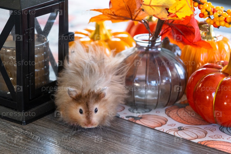 Забавный лохматый пушистый хомяк в Хэллоуин и осенний декор среди тыкв, желтые листья на столе. Фестиваль урожая