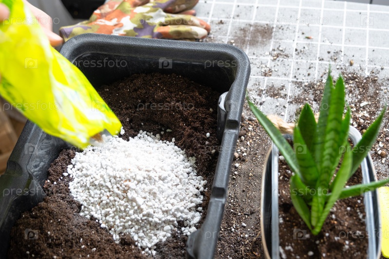 Ингредиенты для почвы домашних горшечных растений, торфа, земли, песка, перлита, вермикулита, кокоса. Смесь для посадки растений в перчатках цветочника смешивают в контейнере
