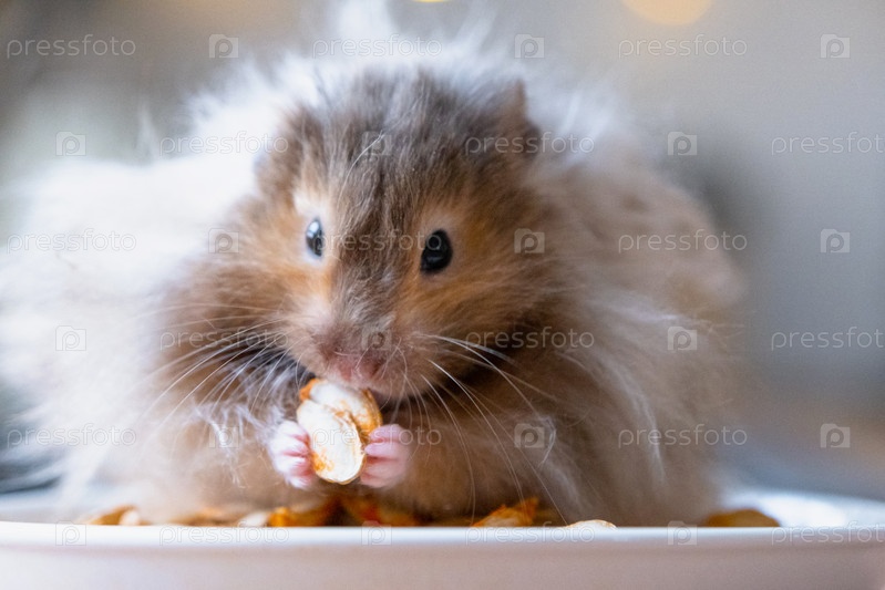 Забавный пушистый сирийский хомяк сидит на горстке семян и ест и набивает щеки припасами. Питание для грызунов, витамины. Закрытие