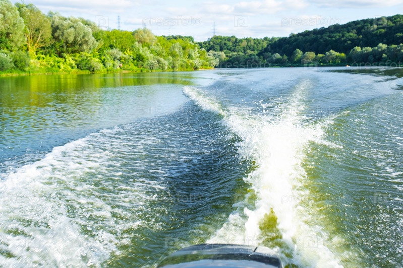 Волны на реке летом от мотора лодки сзади. Водные путешествия, речной лодочный тур, внутренний туризм