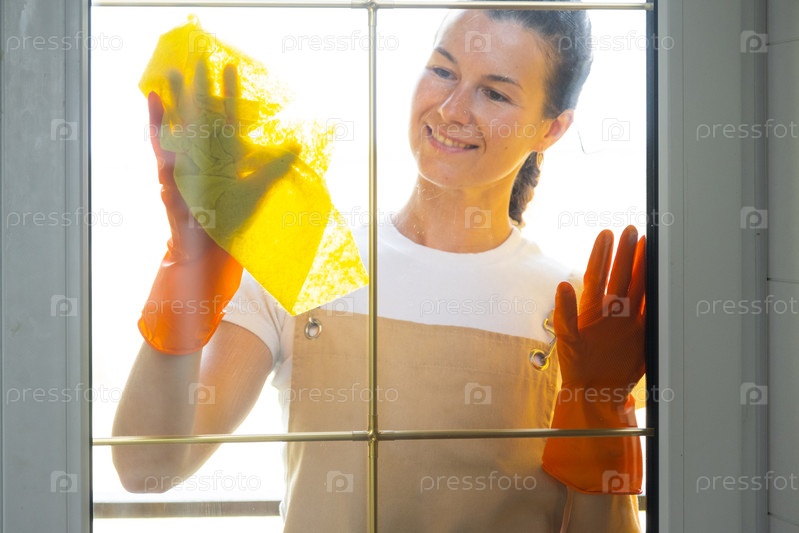 Женщина в резиновых перчатках и фартуке вручную моет оконный балкон дома тряпкой и шваброй снаружи за стеклом. Восстановление порядка и чистоты весной, уборка сервиза