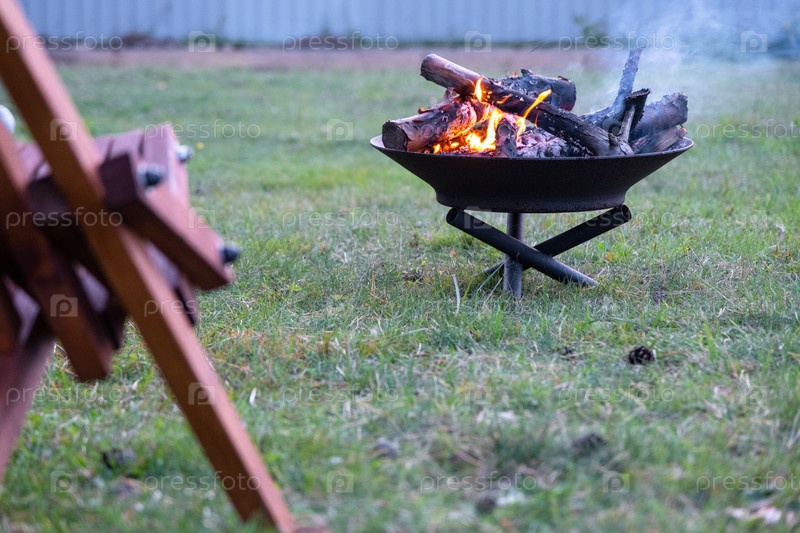 Металлическая огненная чаша с горящей древесиной во дворе и садовая стойка палубных кресел. Безопасная декоративная огненная яма, Пикник в саду