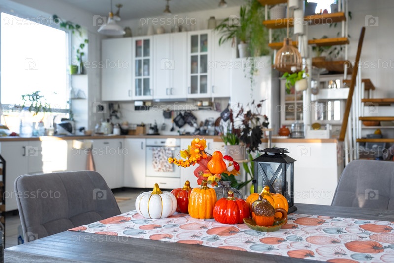 Декор белой классической кухни с тыквами, гирляндами, осенним букетом с желтыми листьями на Хэллоуин и урожай. Осеннее настроение в домашнем интерьере, современный стиль лофта. недвижимость, страхование, ипотека