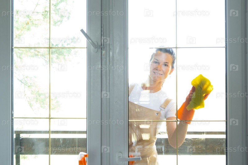 Женщина в резиновых перчатках и фартуке вручную моет оконный балкон дома тряпкой и шваброй снаружи за стеклом. Восстановление порядка и чистоты весной, уборка сервиза