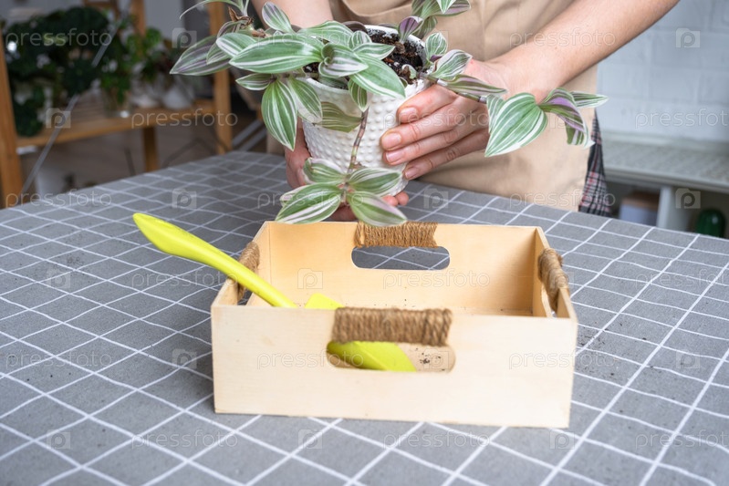 Пересадка и уход за домашним растением в новый домашний интерьер горшка. Женщина выращивает растения хобби, держит полезные растения