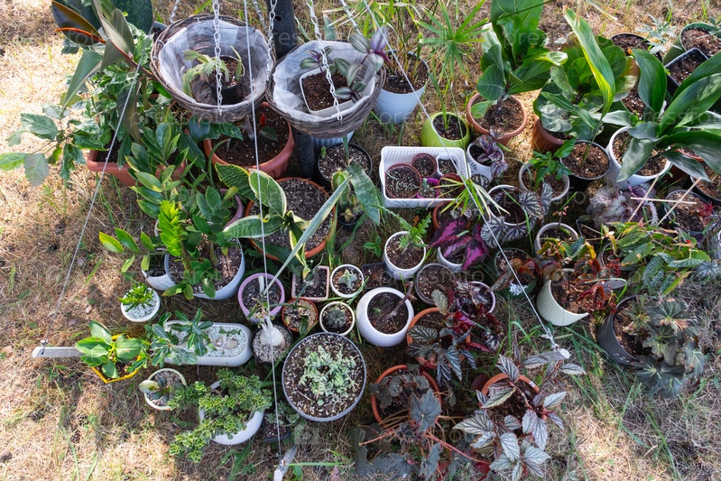 Домашние тропические растения — это группа, выходящая на улицу летом, чтобы ускорить рост. Ходячие домашние растения в горшках в саду