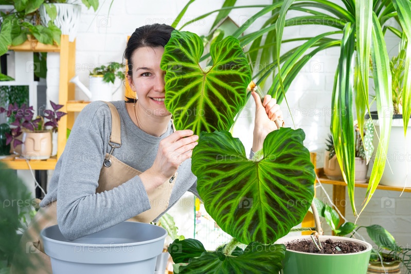Женщина в фартуке держит большой полосатый лист филодендрона и ухаживает за горшечным растением, пересаживая и пересаживая крупное домашнее растение Philodendron verrucosum в новый больший горшок в домашнем интерьере