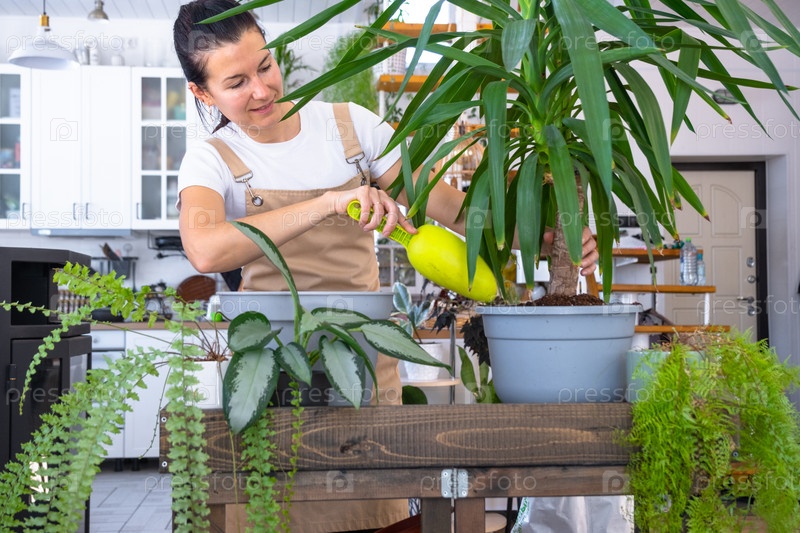 Пересадка и уход за домом растения Юкка в новый горшок в интерьере дома. Женщина разводит и выращивает растения хобби, держит тропическое растение Дракена