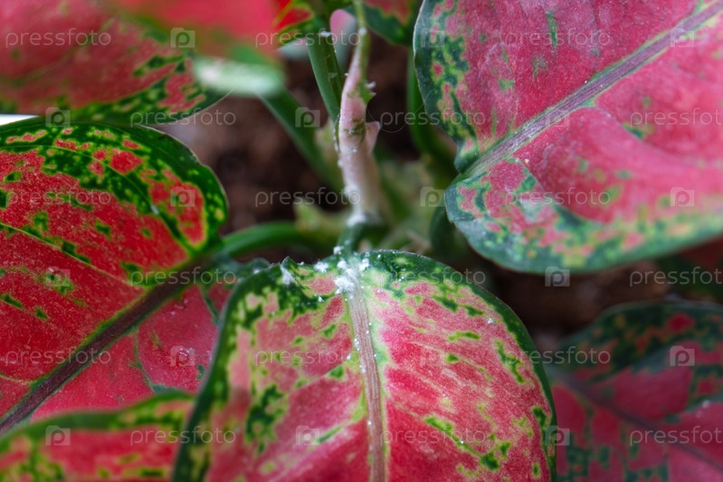 Красный оставляет домашнее растение, пораженное белым покрытием мучных клопов паразита, мелких насекомых, Проблемы в выращивании домашних растений. Обработка растений и борьба с вредителями и грибами