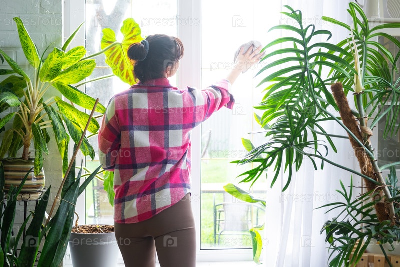 Женщина вручную моет окно дома тряпкой и шваброй внутри интерьера с белыми шторами и домашними растениями. Восстановление порядка и чистоты весной, уборка сервиза