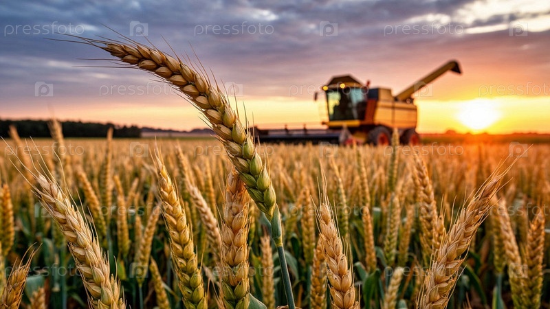 Колосья пшеницы, пашня, поле и комбайн на закате