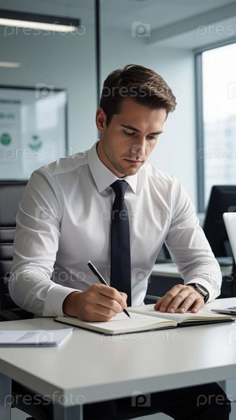 Мужчина в офисе, в белой рубашке и галстуке делает записи в блокноте сидя за столом. Деловая обстановка