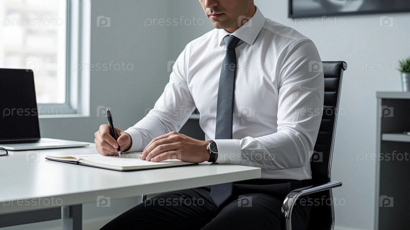 Мужчина в офисе, в белой рубашке и галстуке делает записи в блокноте сидя за столом. Деловая обстановка