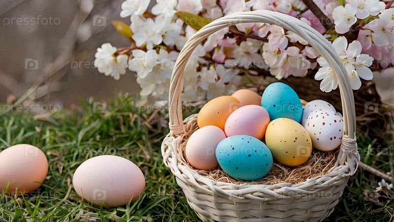 Концепция яркого пасхального праздника. Красивый фон с пасхальными яйцами в плетеной корзине и весенними цветами вишни
