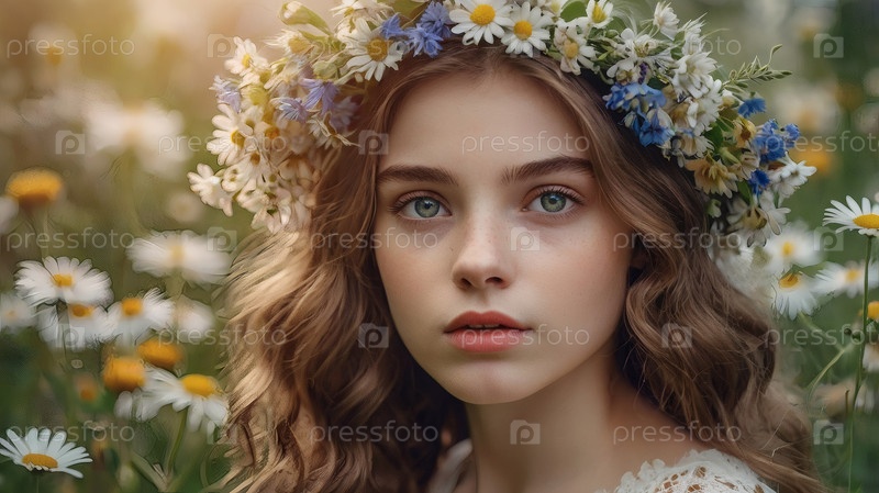 Красивая девушка с венком из ромашек и кукурузных цветов на голове в поле. День святых Петра и Февронии. Всероссийский день семьи, любви, верности