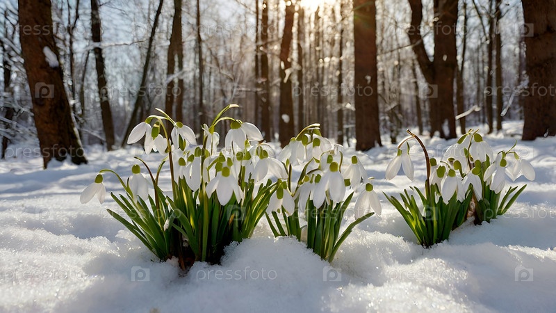 Первые весенние цветы. Белые снегопады в лесу крупным планом на утреннем солнце. Весеннее время