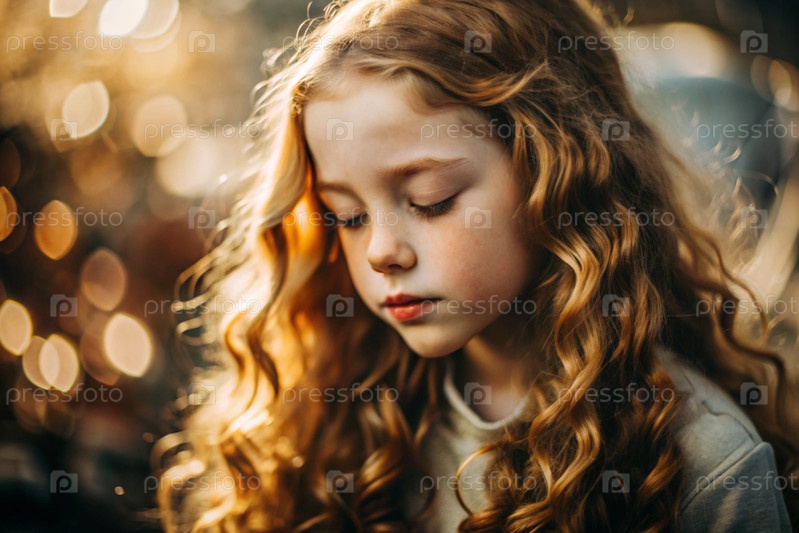 Портрет красивой маленькой рыжеволосой девушки с длинными волнистыми волосами и задумчивым взглядом. Волосы развиваются и создают ощущение легкости и естественности