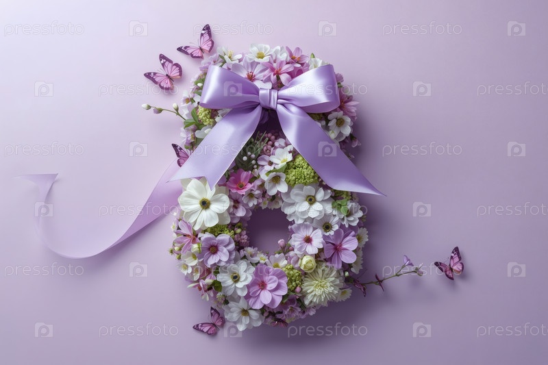 Международный женский день. Баннер, флаер, красивая открытка к празднику 8 марта. Цветы в форме числа восемь и бабочки на сиреневом фоне