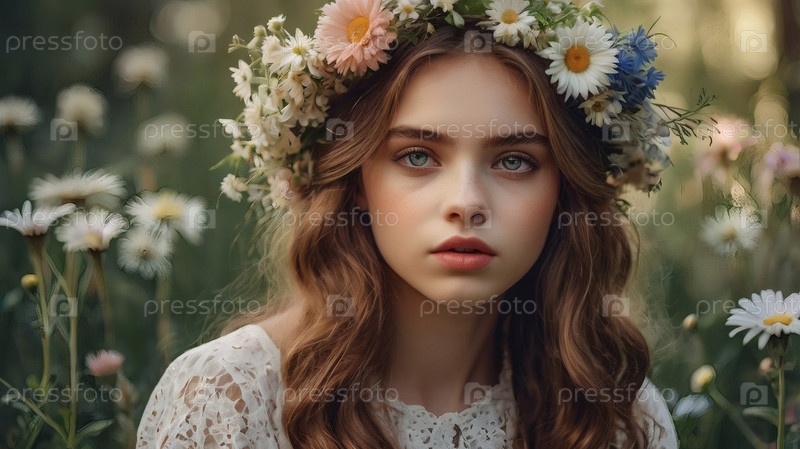 Красивая девушка с венком из ромашек и кукурузных цветов на голове в поле. День святых Петра и Февронии. Всероссийский день семьи, любви, верности