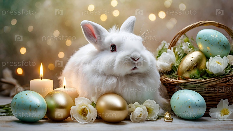 Концепция яркого пасхального праздника. Нежные пасхальные яйца, кролик и нежные цветы на пастельном акварельном фоне с нежными венами