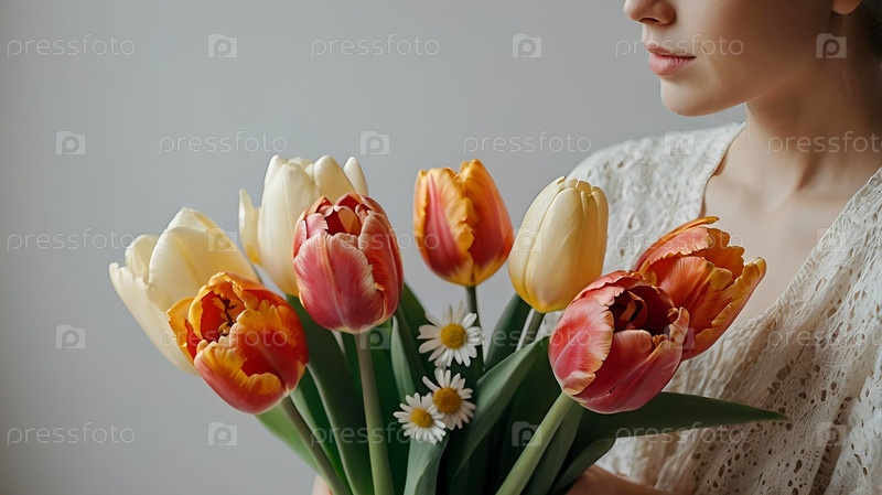 Знамя. Девушка держит красивый букет тюльпанов. Поздравительная открытка на 8 марта и Международный женский день. Концепция поздравлений и торжеств