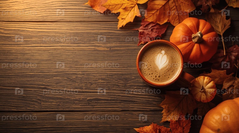 Вкусный тыквенный латте в кружке, тыквах и осенних листьях на деревянном столе. Сезонные напитки. Вкусный горячий капучино. Осенний баннер
