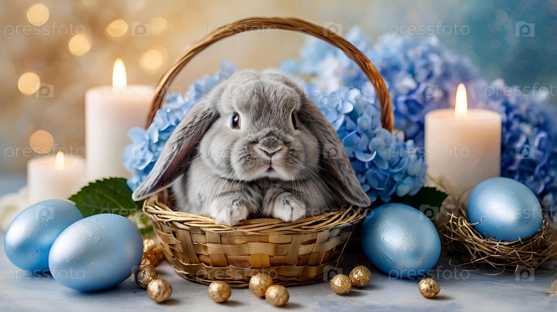 Концепция яркого пасхального праздника. Нежные пасхальные яйца, серый кролик и голубые цветы гортензии на пастельном акварельном фоне с нежными венами