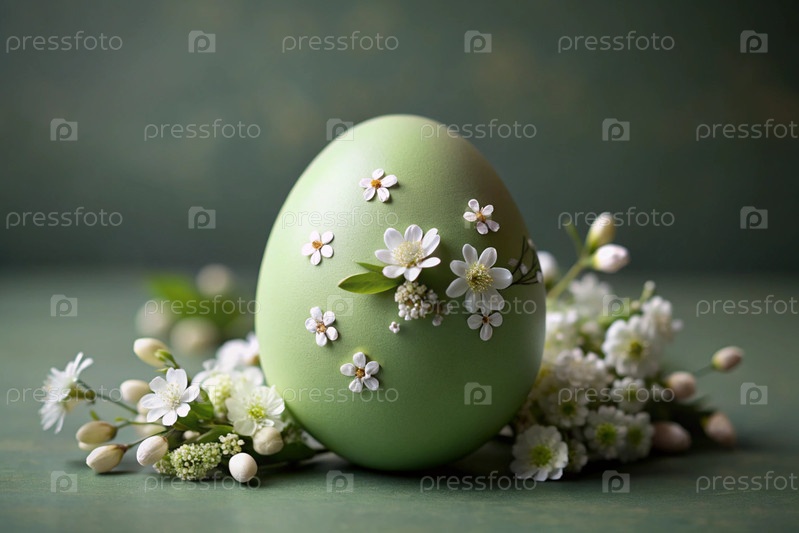 Концепция светлого пасхального праздника минималистична. Пасхальное зеленое яйцо с нежными белыми цветами вишни на мягком зеленом фоне