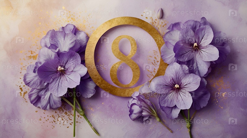 Международный женский день. Праздник приходится на 8 марта. Баннер, флаер. Праздничный, нежный фиолетовый цветочный фон с номером 8