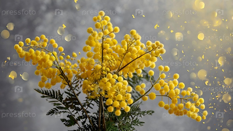 Красивый пушистый букет мимозы на сером фоне. Близко. Идея весны и Международный женский день 8 марта