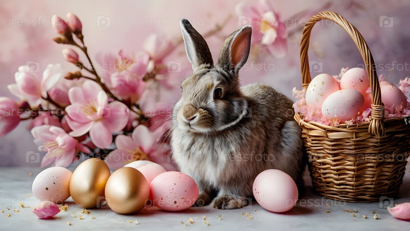 Концепция яркого пасхального праздника. Нежные пасхальные яйца в плетеной корзине, кролик и нежные розовые цветы на пастельно-водяном фоне