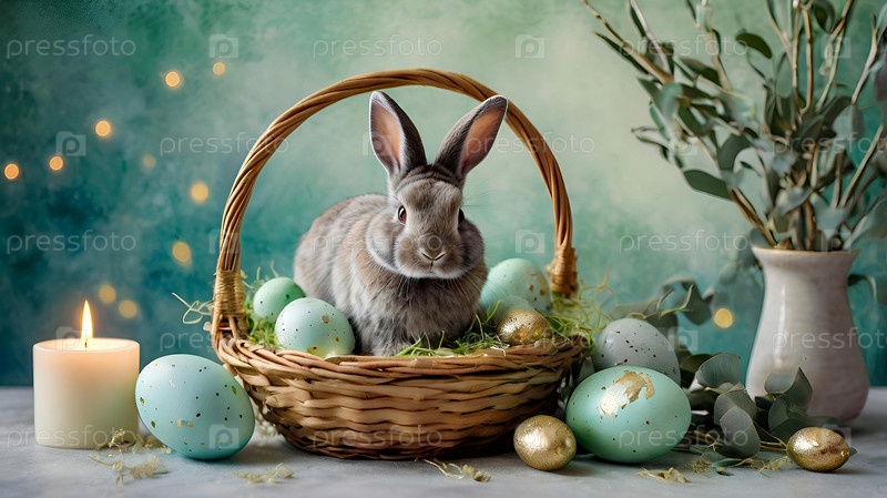 Концепция яркого пасхального праздника. Нежные пасхальные яйца, серый кролик и зеленые ветви эвкалипта на пастельном акварельном фоне с нежными венами