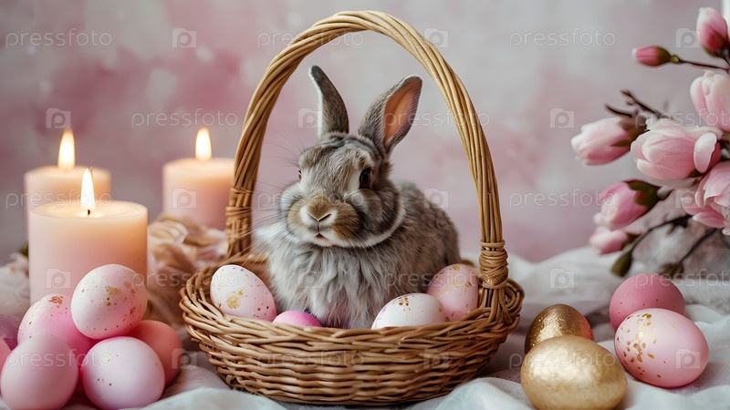 Концепция яркого пасхального праздника. Нежные пасхальные яйца в плетеной корзине, кролик и нежные розовые цветы на пастельно-водяном фоне