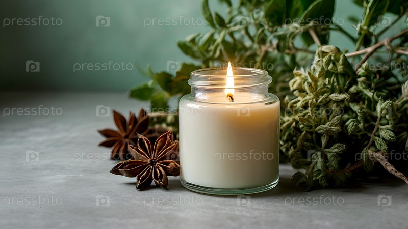 Макет удобно горящей свечи из стекла с пустой белой этикеткой и зеленью в домашнем интерьере