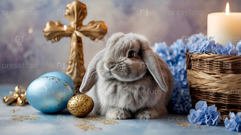 Концепция яркого пасхального праздника. Нежные пасхальные яйца, серый кролик и голубые цветы гортензии на пастельном акварельном фоне с нежными венами