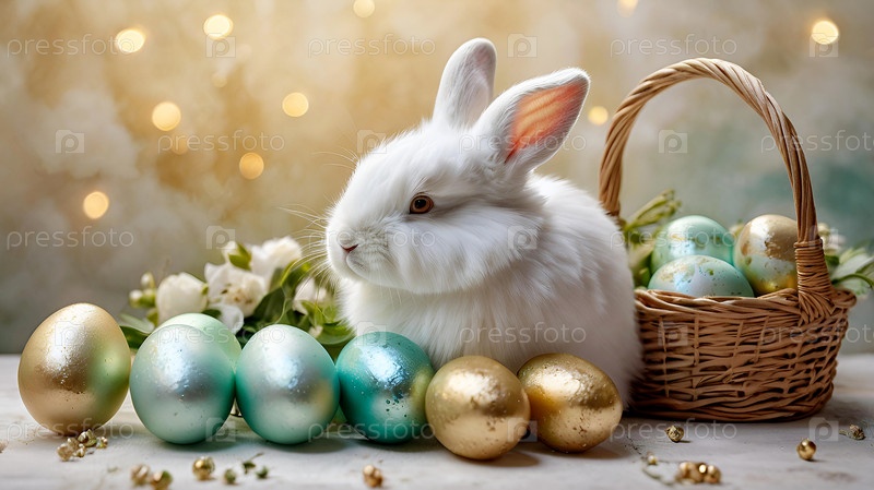 Концепция яркого пасхального праздника. Нежные пасхальные яйца, кролик и нежные цветы на пастельном акварельном фоне с нежными венами