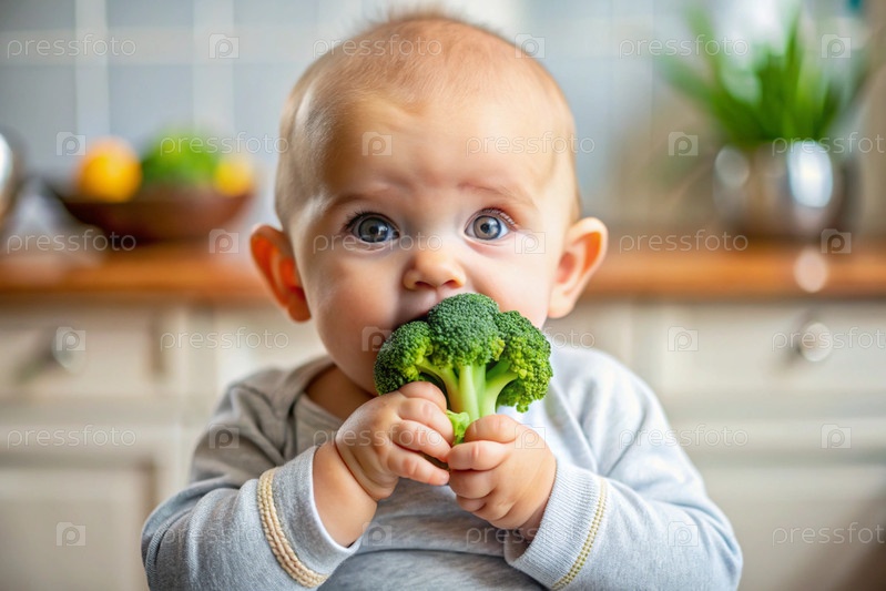 Здоровое детское питание. Первый прием пищи. Кормить ребенка. Симпатичный ребенок ест брокколи. Свежие овощи и фрукты